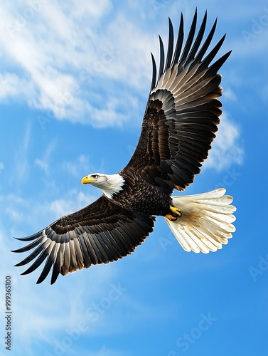 © ckybe, Naklejka premium A magnificent bird glides effortlessly through the open sky, displaying its grand wings against a vivid azure backdrop.