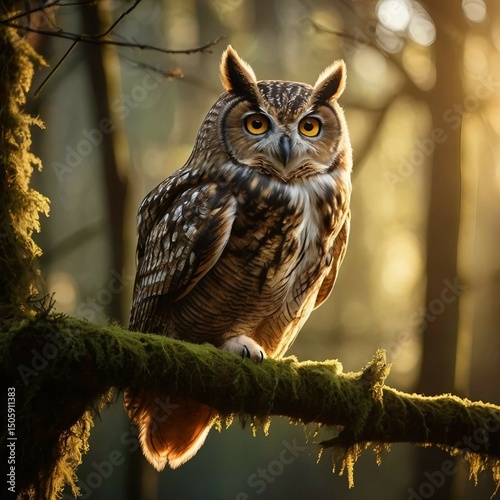 Obraz premium A magnificent brown horned owl, a nocturnal hunter with intense yellow eyes,...
