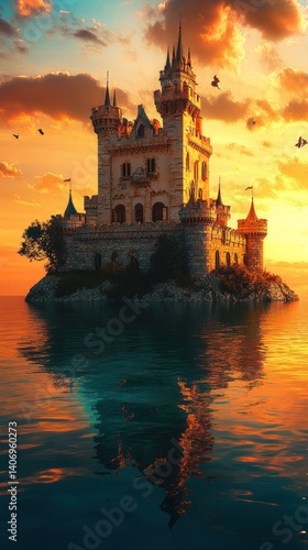 © berkah nikah, Fototapeta premium A magnificent castle stands majestically on a secluded island at sunset.