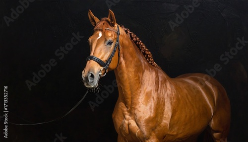 Obraz premium A magnificent chestnut horse, elegantly posed against a deep black backdrop, showcasing its braided mane and sleek coat.
