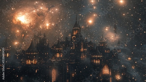 Obraz premium A magnificent gothic castle nestled amongst cosmic light.