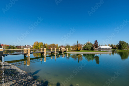 © Alhim, Obraz premium A magnificent green landscape with a river and a bridge on a clear sunny day.