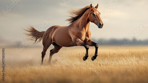 © Adip, Fototapeta premium A magnificent horse gallops across a golden field.