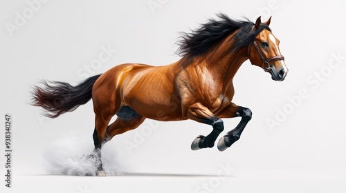 © missisya, Obraz premium A magnificent horse gallops gracefully, showcasing its strength and beauty in motion against a clean, white background.