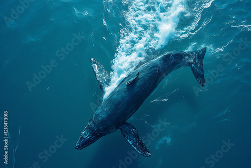 Naklejka premium A magnificent humpback whale is gracefully swimming through the vast and deep ocean waters, showcasing its beauty and elegance