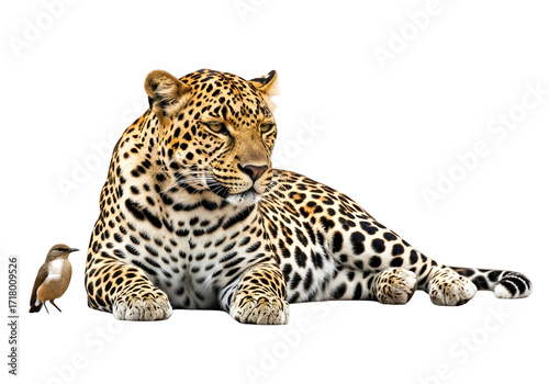 © Konan, Obraz premium A magnificent leopard rests regal against a dark backdrop, with a small bird perched near its paws.