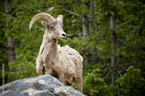 Obraz premium A magnificent male big horn sheep standing in wooded area in Colorado looking right