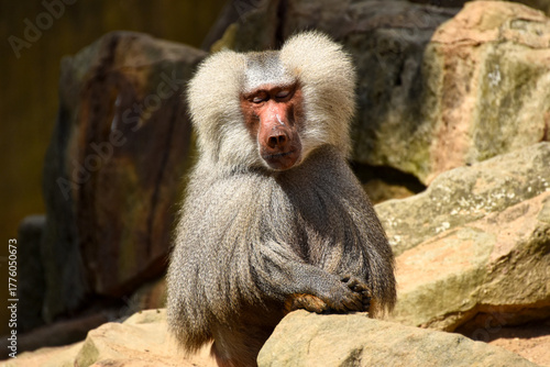 © IbrahimAlkan, Naklejka premium A magnificent male Hamadryas baboon with a flowing silver mane sits stoically on a sunlit rocky outcrop. The focus is on its serious face and powerful build.