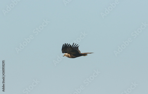 Fototapeta premium A magnificent Marsh Harrier, Circus aeruginosus, flying in the blue sky.