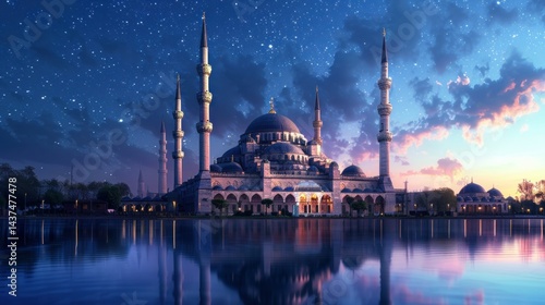 © Ketua, Obraz premium A magnificent mosque under a breathtaking starry sky, illuminating reflections on the serene water surface.