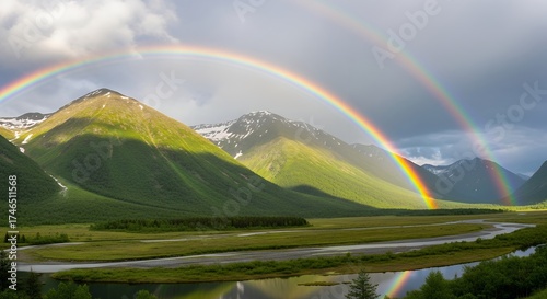 © Ashraf M, Obraz premium A magnificent natural spectacle unfolds with a vibrant double rainbow gracefully arching across a vast mountain landscape. Majestic peaks, some still bearing remnants of snow, rise grandly, their lowe