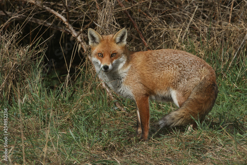 Fototapeta premium A magnificent Red Fox (Vulpes vulpes) searching for food to eat at the edge of shrubland.