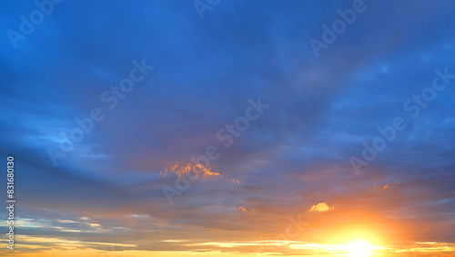 Fototapeta premium A magnificent sunrise with the sun casting a golden glow over the horizon. The sky transitions from deep blue at the top to warm shades of orange and yellow near the horizon. Sunrise sky background.