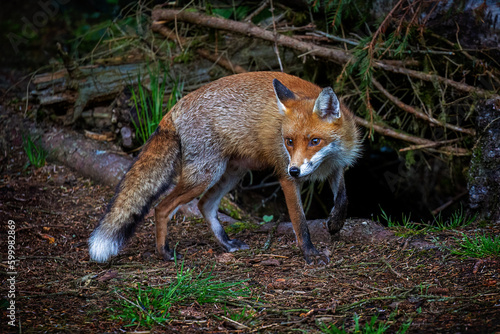 Obraz premium A magnificent wild Red Fox (Vulpes vulpes) hunting for food in woodland.