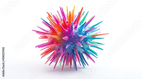 Obraz premium A magnified 3D virus particle with sharp, colorful spikes and a realistic spherical shape, rendered on a clean white background