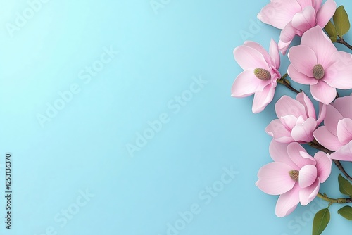 © Anastasiya, Naklejka premium A magnolia branch with soft pink blossoms and green leaves set against a pastel blue background, creating a fresh and minimalistic spring composition