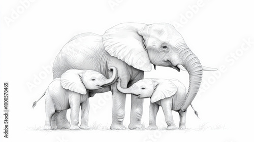 © Nano Photos, Naklejka premium A majestic adult elephant stands protectively with its two playful calves, creating a heartwarming family scene in this beautiful drawing.