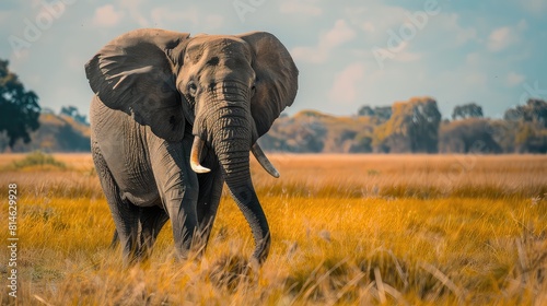 Naklejka premium A majestic African elephant ,its trunk swaying gently in the warm sunshine,...