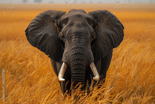 © Anastasia, Naklejka premium A majestic African elephant wandering through the savanna, its wrinkled gray skin contrasting with the golden grasslands top view