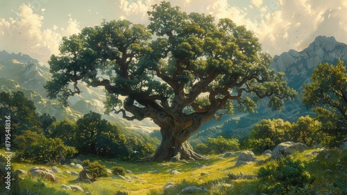 Obraz premium A majestic, ancient tree stands tall in a serene landscape, surrounded by...