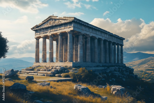 © Mathias, Fototapeta premium A majestic and ancient greek temple standing tall on a rugged hill top