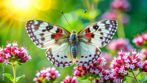 © Sirinporn, Naklejka premium A majestic Apollo butterfly with striking red-spotted white wings flutters around a vibrant pink oregano bloom in a lush green summer meadow.