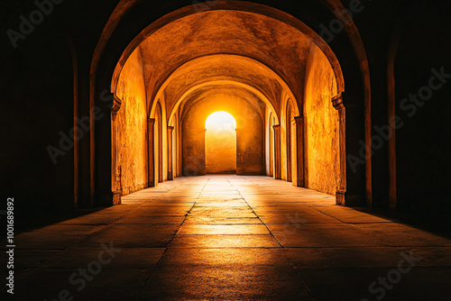 © alexandr, Fototapeta premium a majestic arched hallway is filled with sunlight casting a warm glow through the corridor creating soft shadows and a peaceful ambiance