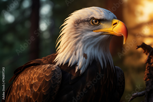 Fototapeta premium A majestic bald eagle in the forest, bathed by golden sunlight, with detailed feathers and piercing eyes.