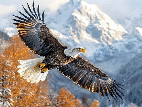© Thares2020, Obraz premium A majestic bald eagle soaring over a dramatic mountain range