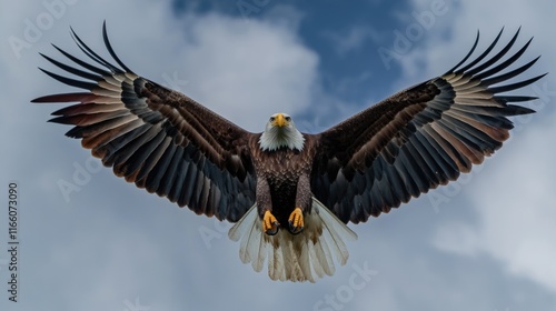 Fototapeta premium A majestic bald eagle soaring through a cloudy blue sky