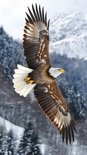 Obraz premium A majestic bald eagle soars through the air, its powerful wings outstretched against a snowy mountain backdrop.