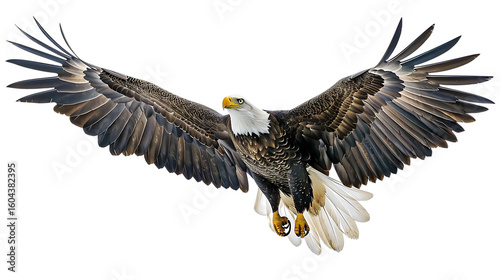 Naklejka premium A majestic bald eagle soars with wings fully extended against a solid color backdrop isolated with white background