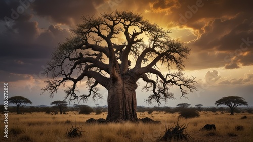 Obraz premium A majestic baobab tree stands tall against a dramatic sunset sky in the African savanna. (1)