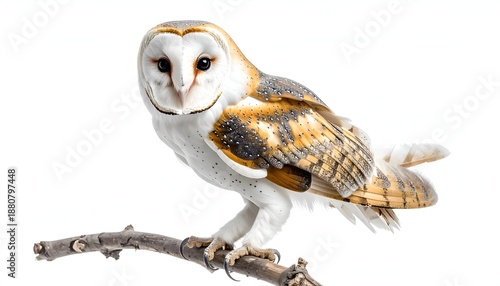 © Matthew, Obraz premium A majestic barn owl perched on a branch, showcasing its strikingly patterned feathers