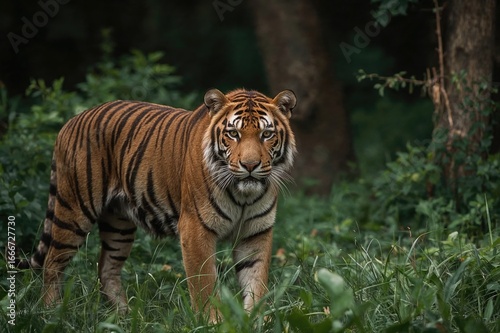 © vxnaghiyev, Fototapeta premium A majestic Bengal tiger staring directly into the lens amidst dense forest foliage.