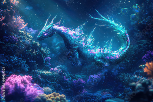 Naklejka premium A majestic bioluminescent dragon graces a vibrant coral reef, illuminating the tranquil underwater world with its mesmerizing colors and ethereal presence.