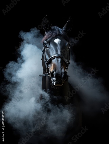 © Johannes, Fototapeta premium A majestic black horse galloping through a cloud of smoke on a dark background.