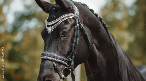 Obraz premium A majestic black horse stands gracefully, wearing an embellished bridle...