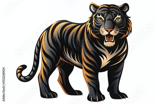 Naklejka premium A majestic black tiger stands proudly, its amber eyes gleaming with power and grace, a symbol of wild strength and untamed beauty against a stark white background.