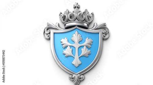 Fototapeta premium A majestic blue shield adorned with silver and crowned, representing noble heritage against a pristine backdrop
