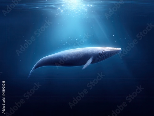 © Sasiwan, Obraz premium A majestic blue whale swims gracefully in deep blue waters, illuminated by soft sunlight filtering through the surface.