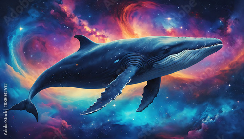 Fototapeta premium A majestic blue whale swims through a starry cosmos, its silhouette outlined against a backdrop of vibrant nebulae and distant galaxies.