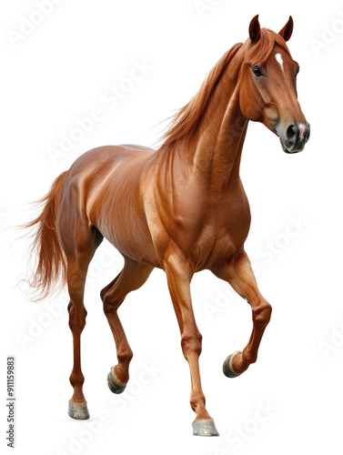 © sergign, Fototapeta premium A majestic brown horse captured walking gracefully against a transparent background, showcasing the beauty and elegance of the animal in a clean setting.