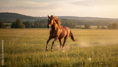 © Paylopiii, Fototapeta premium A majestic brown horse gallops freely through a sunlit green meadow at golden hour, with rolling hills in the background.