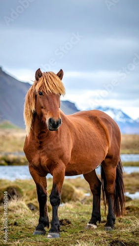 © Muhamad, Fototapeta premium A majestic brown horse stands in a grassy meadow by a stream