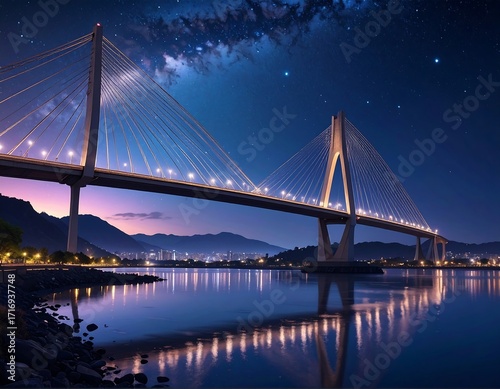 Fototapeta premium A majestic cable-stayed bridge spans a tranquil body of water at night, under a starry sky
