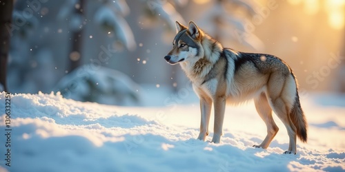 © Kritsana, Naklejka premium A Majestic Canine in a Winter Wonderland, Standing Proudly Amidst Falling Snow During Golden Hour