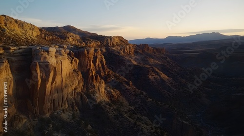 Obraz premium A majestic canyon landscape at sunrise with the warm glow highlighting the rugged rock formations