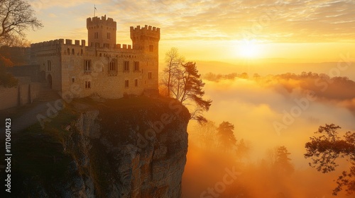Fototapeta premium A majestic castle perched on a cliff, surrounded by mist, illuminated by a warm sunrise, creating a serene and enchanting atmosphere.