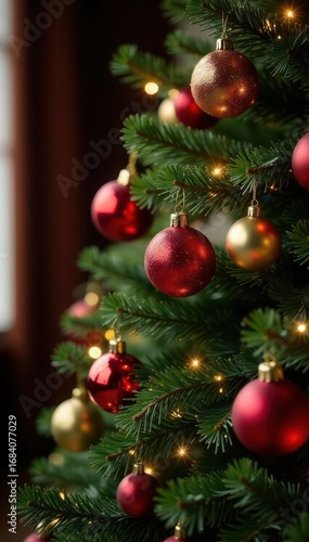 Fototapeta premium A majestic Christmas tree adorned with shimmering red and gold ornaments ,...